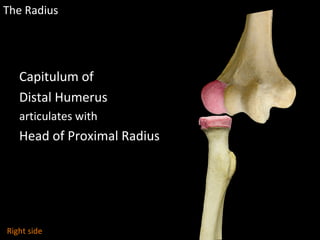 The capitulum laterally articulates with the radius. It articulates with the cupshaped depression on the head of the radius and. Just above these bony areas are two small depressions.